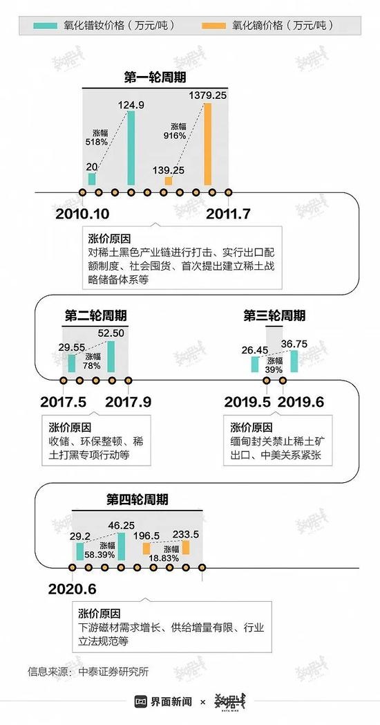 2009年,中国明确以宏观调控市场配额的手段,推动稀土企业的联合重组,加强对稀土行业的管理。次年起,中国稀土行业迎来涨价潮,并在此后又经历了两轮涨价期。