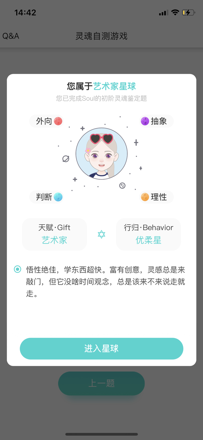 进入Soul的页面,从注册使用开始,首先要经历一次灵魂自测,通过针对性的灵魂鉴定题目,在将不同的性格特点的每个人,匹配到合适的“星球”,最终找到所谓的Soulmate(灵魂伴侣)。