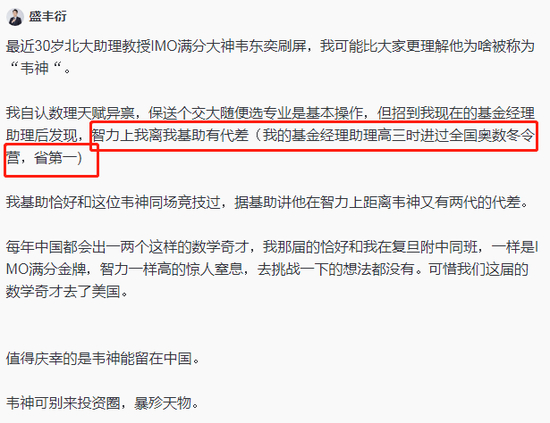 盛丰衍还曾在雪球表示,自己的助理高三进过全国奥数冬令营,拿了省第一,他还祈祷清华网红数学家韦神千万别来投资圈抢饭碗。