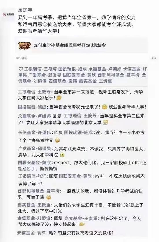 截图显示,华夏基金经理屠环宇,转发了一条“支付宝学神基金经理高考打CALL集结令”的朋友圈,并留言“又到了一年高考季,把我当年全省第一、数学满分的实力和运气用意念传送给大家,希望大家都能考个好成绩,欢迎报考清华大学”。