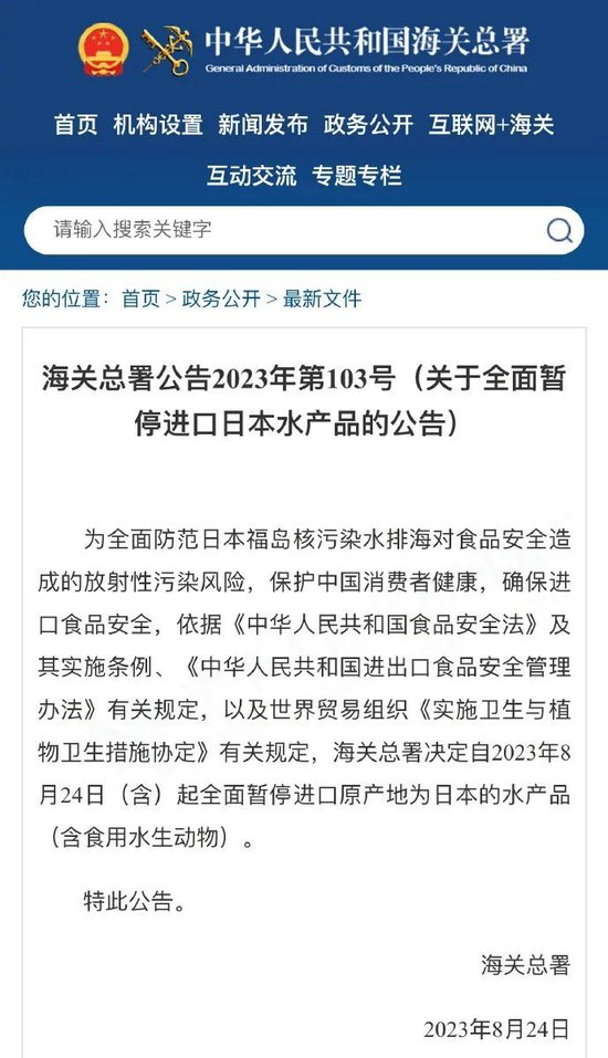 此前,海关总署宣布,延长包括福岛在内的10个县(都)食品进口禁令,并对来自日本其他地区的食品特别是水产品(含食用水生动物)严格审核随附证明文件,实施100%查验,而在8月24日,海关总署决定自当日起全面暂停进口原产地为日本的水产品(含食用水生动物)。