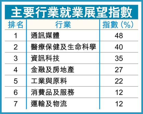 然而,主要行业的就业展望指数均录得正数,反映所有受访行业雇主均表示期望于第四季增加员工人数,排名前三位的行业分别是通讯媒体(+48%)、医疗保健及生命科学(+40%)和信息科技(+35%)。