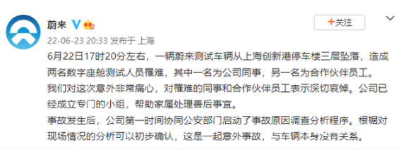 6月23日,蔚来官微发布消息称:6月22日,一辆蔚来测试车辆从停车楼三层坠落,造成2名数字座舱测试人员罹难,其中一名为公司同事,另一名为合作伙伴员工。