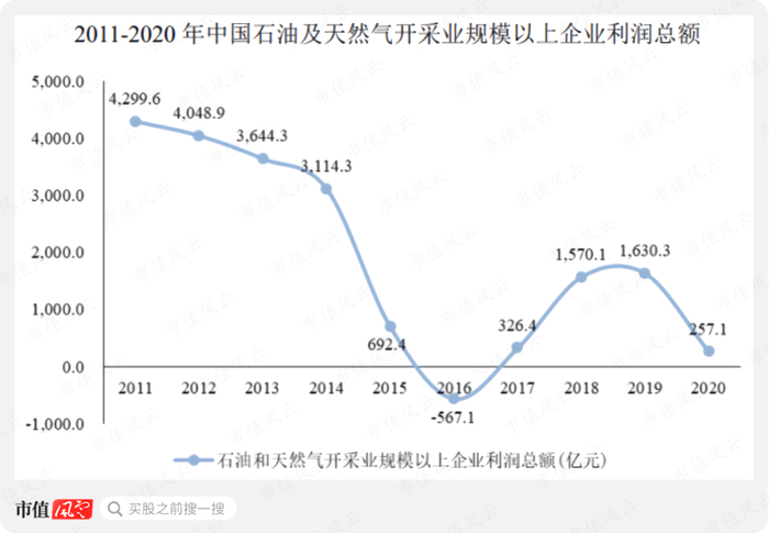 2011-2020年,中国油气开采规模以上企业利润总额由4300亿降至257亿,最惨的2016年为亏损567亿。