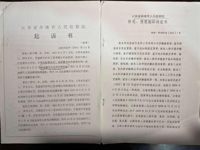 2003年6月28日,曲靖市检察院以徐天福涉嫌非法买卖爆炸物罪、行贿罪、偷税罪、虚开增值税专用发票罪、虚开用于抵扣税款的其他发票罪5个罪名,东华公司涉嫌偷税罪、虚开增值税专用发票罪、虚开用于抵扣税款的其他发票罪3个罪名,向曲靖中院提起公诉。