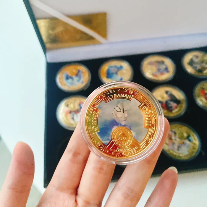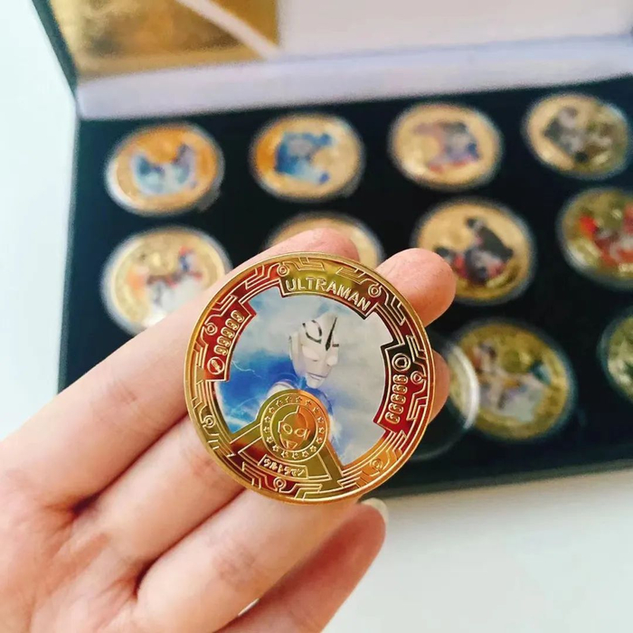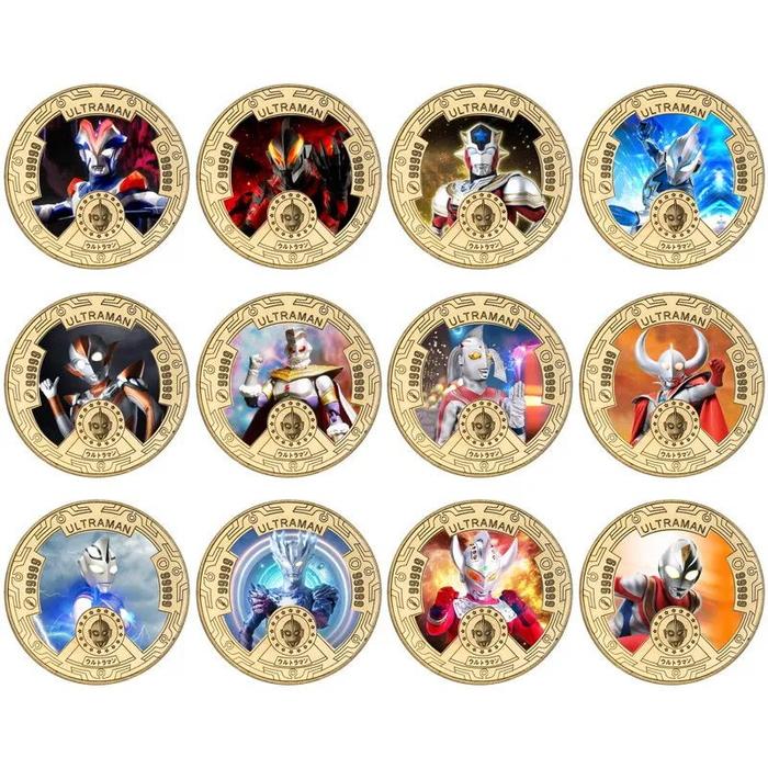 全套共有12枚,正面是不同的奥特曼英雄,它们分别是泰罗、阿古茹、诺亚、纳伊斯、迪迦、高斯、佐菲、赛罗、赛文、戴拿、希卡利、雷欧,展现了奥特曼从1967年第二部正式发展至今的繁荣与辉煌