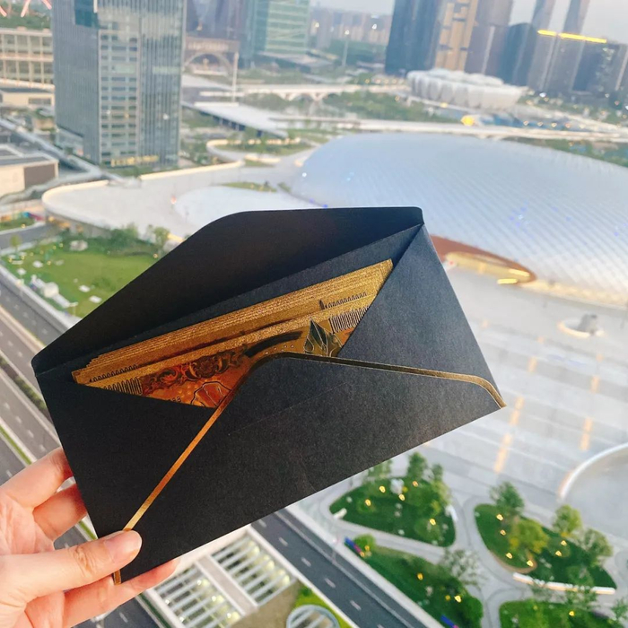纪念钞装在黑底金边的信封中,纤薄挺括好收纳,拿在手中分量和质感满满~