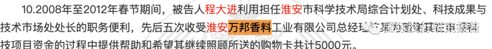 公司核心技术人员陈兆刚,2008 年至 2012年春节期间,涉嫌行贿金额0.5万元,2017 年 10 月,受贿人程大进被刑事判决【(2017)苏0813 刑初 207号】,未被立案,2008 年至 2012 年春节期间,被告人程大进利用担任淮安市科学技术局综合计划处、科技成果与技术市场处处长的职务便利,先后五次收受淮安万邦香料工业有限公司总经理陈某为感谢其在申报科技项目资金的过程中提供帮助和希望其继续照顾所送的购物卡共计 0.5 万元