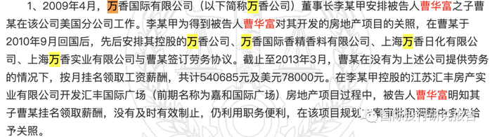 2009 年 4 月,万香公司董事长李某甲安排被告人曹华富之子曹某在该公司美国分公司工作。李某甲为得到被告人曹华富对其开发的房地产项目的关照,在曹某于 2010 年 9 月回国后,先后安排其控股的万香公司、万香国际香精香料有限公司、上海万香日化有限公司、上海万香实业有限公司与曹某签订劳务协议。截止至 2013 年 3 月,曹某在没有为上述公司提供劳务的情况下,按月挂名领取工资薪酬,共计 54.07 万元、美元 7.80 万元。被告人曹华富明知其子曹某挂名领取薪酬,没有及时有效制止,并利用担任淮安市规划局局长的职务便利,为李某甲控股的江苏汇丰房产实业有限公司开发汇丰国际广场(前期名称为嘉和国际广场)房地产项目的规划方案审批和调整谋取利益。