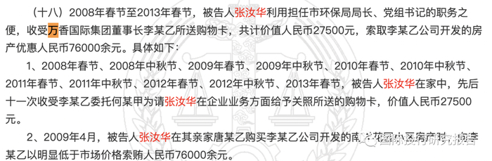 2008 年春节至 2013 年春节,被告人张汝华利用担任市环保局局长、党组书记的职务之便,收受万香国际集团董事长李某乙所送购物卡,共计价值人民币 2.75 万元,索取李某乙公司开发的房产优惠人民币 7.60 万余元。具体如下: