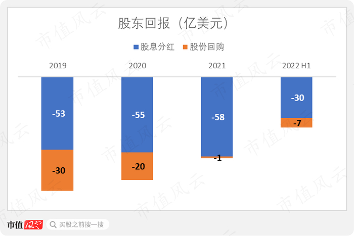 在股东回报方面,公司自2019年来的三年半共发放股息分红196亿美元,回购股份所花现金为58亿元,二者共占同期自由现金流的133%。其中股息分红十分稳定且多年来持续增长。