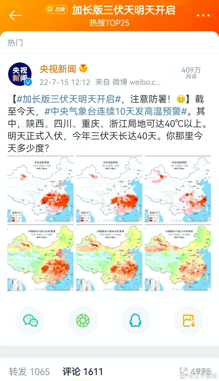 日前,中央气象台还连续10天发高温预警,陕西、四川、重庆局部地区可达40度以上。