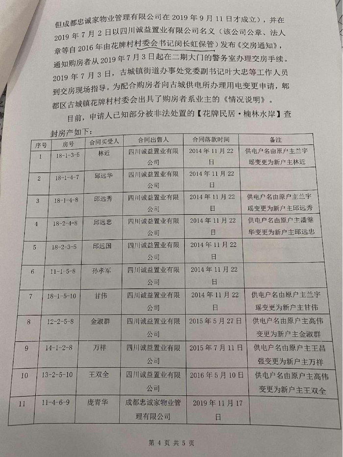 2019年7月3日,也就是在青羊区法院下达执行令之后,购房者还被通知到楠林水岸2期大门的警务室办理交房手续。为配合购房者向供电部门办理用电变更申请,古城镇花牌村委会出具了“购房者系业主”的《情况说明》。