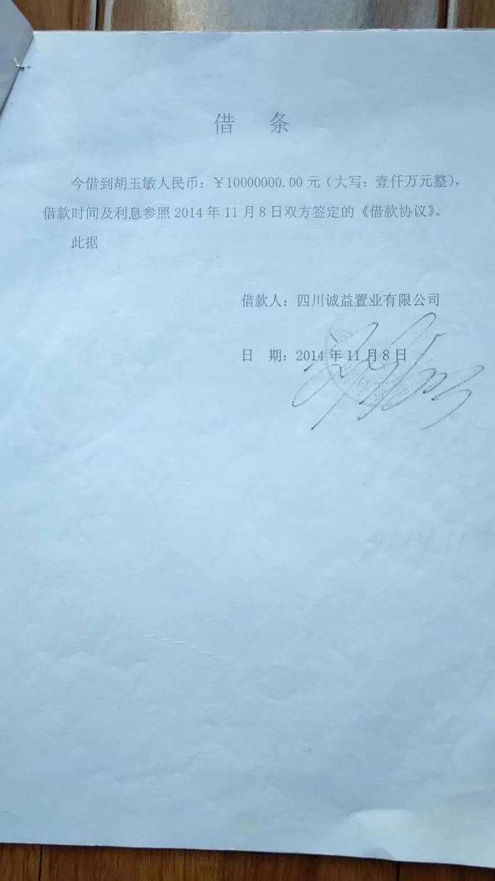 胡玉敏称,自2011年12月8日起,诚益公司多次向她借款,用于成都市郫都区古城镇(2019年,古城镇与三道堰镇合并)花牌村“花牌民居·楠林水岸”项目建设。截止2014年11月8日,双方确认诚益公司共计欠她的款项除开零头后,还有借款整数本金1000万元。