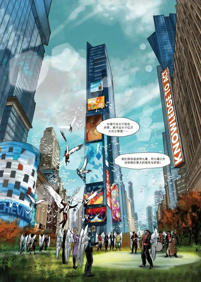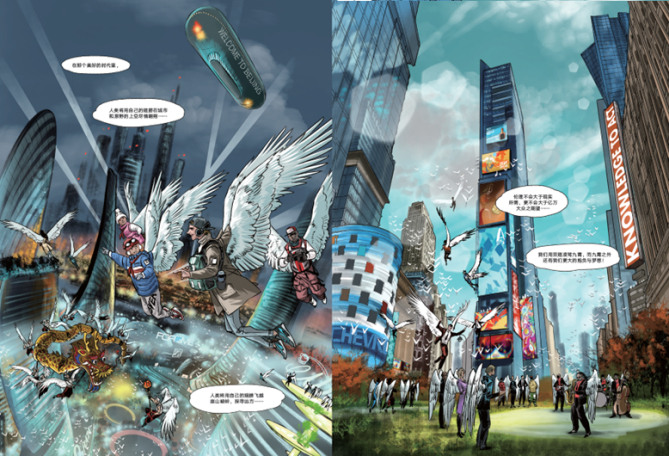 这是漫画《天使时代》里,人类用自己的翅膀飞翔在城市和原野的上空,飞越崇山峻岭,探寻远方。