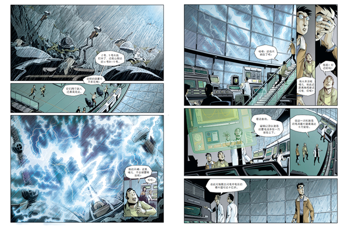 例如,《球状闪电(上)》的一处双折页全景图,既承接了上文,又交代了全书的大背景,巧妙地解释了为什么要研究球状闪电和高科技武器,推动了剧情的发展。