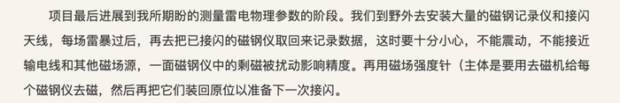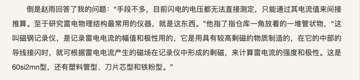 在讲到“对雷电内部结构的探测方法”时,原著中“电流值”“磁钢记录仪”“剩磁”等文字表达,对于理科知识不太强的读者来说,这段描写要在脑海中形象化地理解,是挺有难度的。