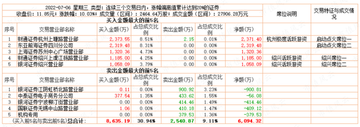 7月7日、8日、11日三天继续涨停,但振幅加大,成交量也大幅增加,期间的龙虎榜数据显示,点火席位中的财通证券杭州上塘路买入3559万元,卖出3859万元,以对倒为主。