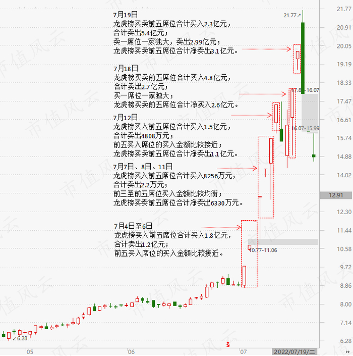 7月15至18日的龙虎榜数据显示,买一至买五席位全是“新”席位,行情开始的点火席位全部消失。并且是一家独大的买入,买二至买四席位的金额远远小于前者,说明市场多方均衡被打破了。