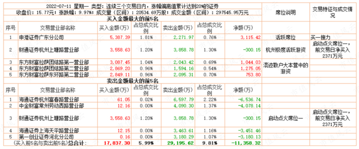 申港证券广东分公司买入5387万元,卖出2272万元。市值风云APP“吾股大数据”监测显示,该席位在市场中比较活跃,但以接力为主,11日净买入3115万元,但在12日净卖出4730万元,最近参与的个股是恒大高新(8个交易日7个涨停)。
