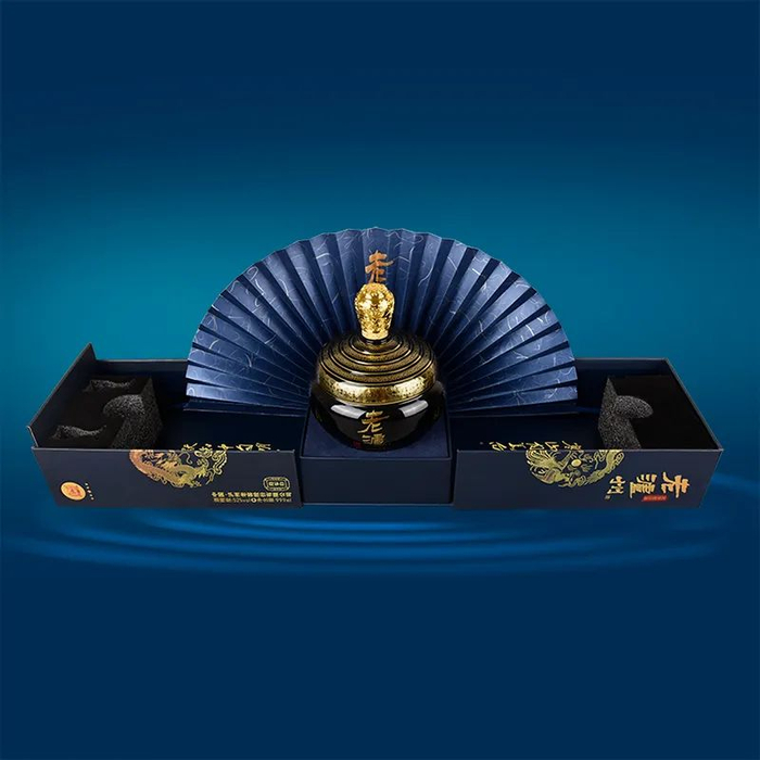 深蓝色的高贵配色,配合云纹环绕的鎏金瓶盖、烫金龙纹及文字,都显得非常奢华尊贵。