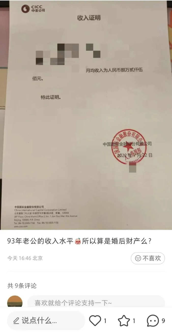 而收入证明的打印纸logo,还有落款的大红章,表明这个员工(也就是女网友的老公),来自中金公司。