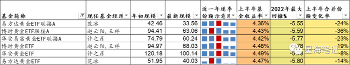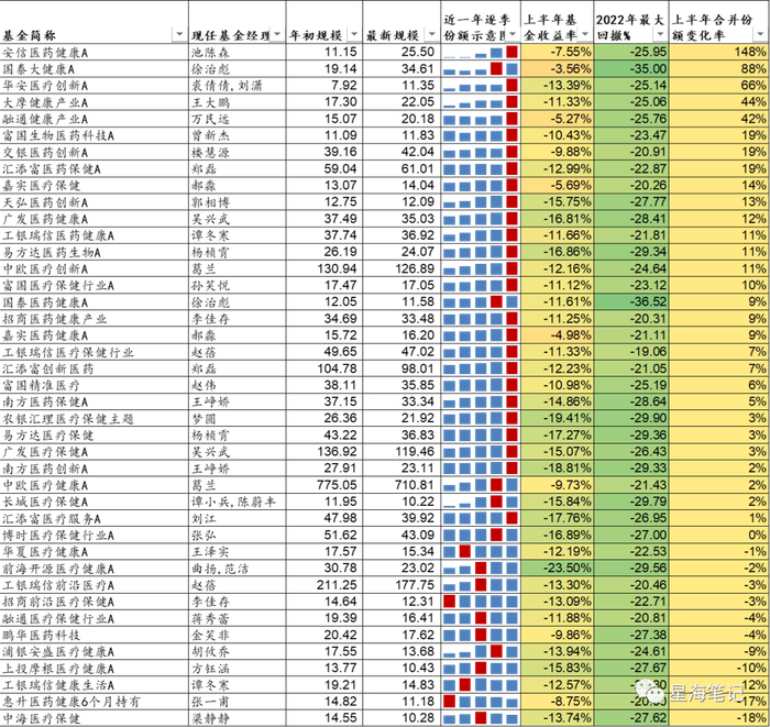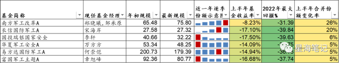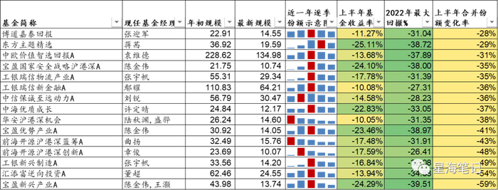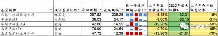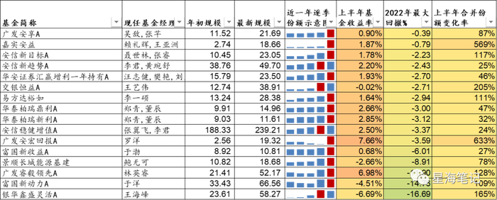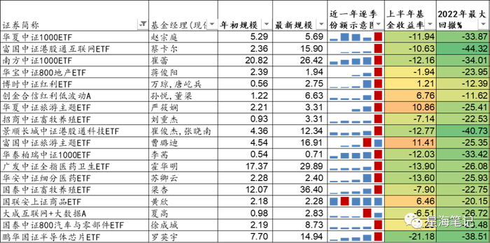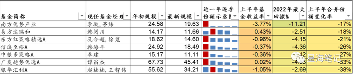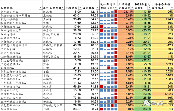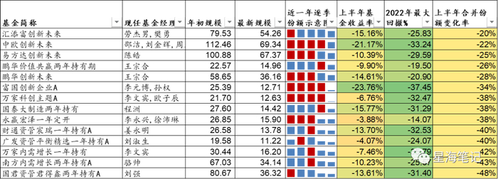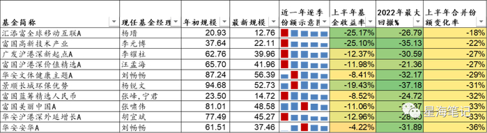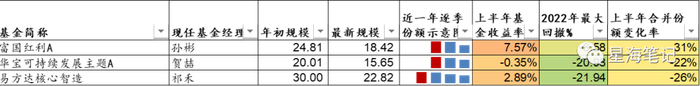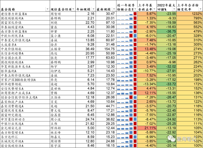 注:为符合一般认知,本文表格中的“基金规模”均是基金在去年底和今年6月30日的合并资产净值(亿元,即一只基金的总市值规模),但用以比较基金规模变化采用的是基金份额(最右一列),基金份额剔除了市值变动对基金规模的影响,从而更为准确的体现投资者行为。此外,为讨论方便和减少异常值影响,剔除了年初规模在2亿以下的基金。另外,本文主要采用2022年上半年数据,未来可以扩展到更长区间。