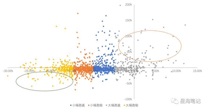从下图可以看出,按照指数收益和跑赢或跑输指数5%为界,可以把基金业绩分成大幅跑赢、小幅跑赢、大幅跑输、小幅跑输这四组。大幅跑赢指数的基金业绩对规模的正贡献似乎更大,大幅跑输对规模的影响要远远小于大幅跑赢,可能是客户受到持损等回本的心理影响缘故。而小幅跑输、跑赢对基金规模的短期贡献并不显著,规模影响更多是来自其他因素。稍微好于指数的业绩水平还没有那么“亮眼”,换句话说就是放在人堆里看不出来了,并不一定能成为销售的有力武器。