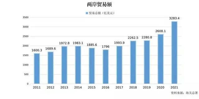 2021年,台湾地区对大陆(不含香港特别行政区)的出口总额近2500亿美元,贸易顺差突破1700亿美元,再创历史新高。