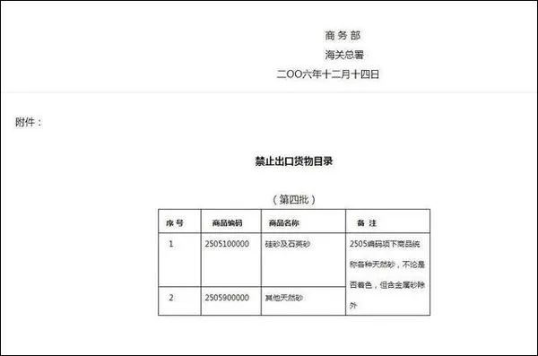 2006年12月,商务部会同海关总署发布第87号公告,宣布自2007年3月1日起禁止天然砂出口措施。