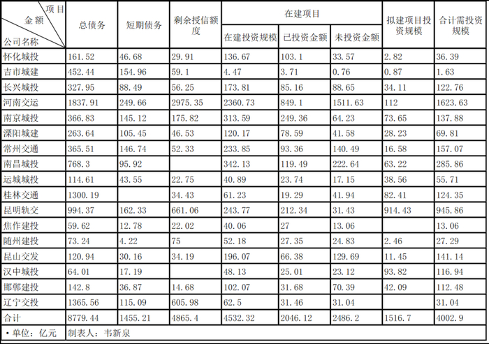 从上方的表格中我们可以看出,17家企业的总债务为8779.44亿元,短期债务为1455.21亿元,其中桂林交通未明确表明其短期债务。有3家公司总债务超千亿元,皆是交通运输企业,分别为河南交运、桂林交通及辽宁交投。短期债务占比方面,随州建投最低,为5.76%;常州交通最高,为40.15%。从授信余额方面来看,2家公司未提及授信余额情况,另外15家公司授信余额总计4865.4亿元,有1家公司授信余额超千亿,为河南交运的2975.35亿元。
