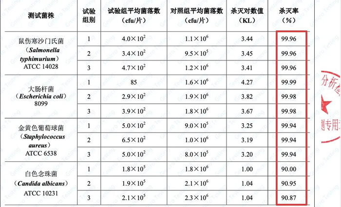 经检测,实验条件下,它对大肠杆菌、金黄色葡萄球菌、鼠伤寒沙门氏菌的杀灭率>99.9%,白色念珠菌杀灭率>90%。