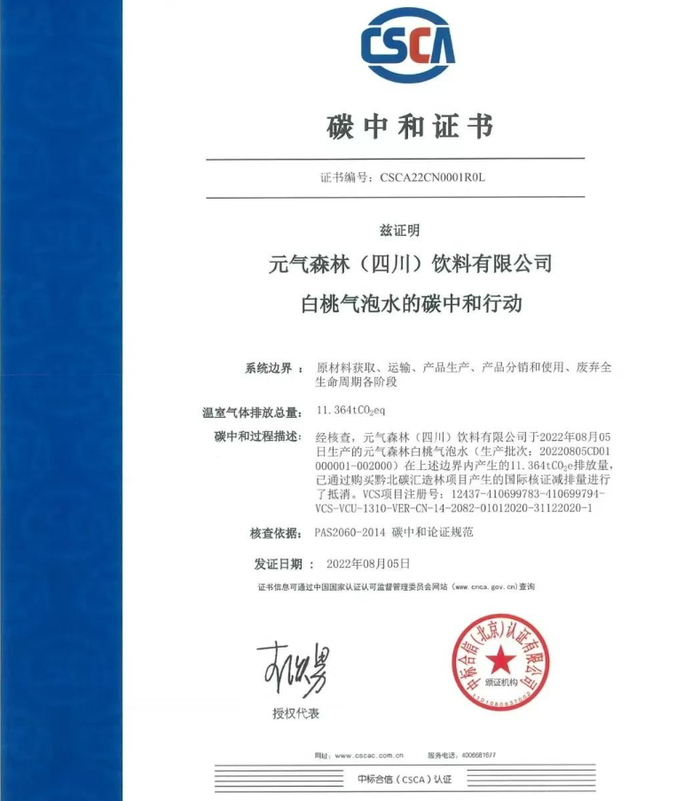 此次“零碳”气泡水打造是基于LCA方法学,对元气森林四川都江堰碳中和工厂生产的白桃味气泡水进行了从原料获取及运输、生产加工、到分销及尾端处理的全生命周期碳足迹分析,并通过注销等量减排量完成中和,该抵消来源为黔北林业碳汇项目,满足气候、社区和生物多样性(CCB)标准,最终获得权威认证机构中标合信颁发的“碳中和认证(基于PAS2060)”,这也是中标合信在饮料消费品领域颁发的首张碳中和证书。