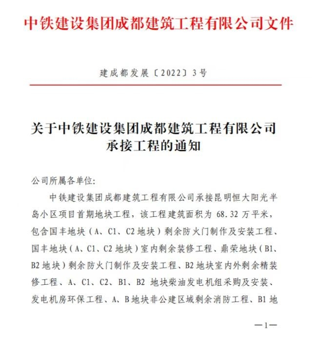 近日,一份网传文件显示,中铁建设集团成都建筑工程有限公司发布承接工程的通知,中铁建设集团成都建筑工程有限公司承接昆明恒大阳光半岛小区项目首期地块工程,该工程建筑面积为68.32万平米。具体包含国丰地块(A、C1、C2地块)剩余防火门制作及安装工程,国丰地块(A、C1、C2地块)室内剩余装修工程、鼎荣地块(B1、B2地块)剩余防火门制作及安装工程、B2地块室内外剩余精装修工程,A、C1、C2、B1、B2地块柴油发电机组采购及安装发电机房环保工程、A、B地块非公建区域剩余消防工程、B1地块地下室消防工程,B地块污水处理再生利用工程、55#-73#、S40#-S42#楼灯光亮化工程,A、C、B2地块太阳能安装工程,临电设施设备迁改工程。交楼区(A、C1、C2、B2地块)剩余园建工程,A、C1、C2、B1、B2地块剩余永久用水工程。该工程合同额为6.3亿,共有140栋建筑,分别为10栋公建,17栋商业、23栋高层住宅、24栋洋房、63栋别塑、3栋公寓。相关资料显示,在2018年昆明市举办的南博会上,恒大与嵩明县政府签约开发恒大阳光半岛和恒大童世界,投资金额近650亿元。其中恒大阳光半岛于2019年3月底推出市场,规划面积约6000亩,当时共推出3400套房源,有高层、洋房、别墅和公寓,刚开盘时宣传的价格是6880元/平米起。根据规划,昆明恒大阳光半岛内部规划方面,项目自建恒大影城、度假酒店、商业街、会议饮食中心、亲子庄园、运动中心、运动公园、儿童反斗城、儿童游乐城、儿童体验馆、KTV等百亿文旅配套,全方位满足吃、住、行、逛、游、购等多元化生活需求。值得一提的是,在2022年6月20日,恒大地产在云南微信公众号发布的恒大在滇项目的工程进度也包括了昆明恒大阳光半岛项目,根据当时的消息,恒大阳光半岛公布了A、B2、C1和C2的工程进度,其中A地块及C1地块两个地块的工程进度比较明显,其外立面、小区围墙抹灰等工程已在收尾。B2地块在6月21日正式进场施工,C2地块启动施工。据了解,中铁建设集团是世界500强中国铁建股份有限公司的房建旗舰企业。具有建筑、市政施工总承包特级资质,房地产开发一级资质等11项行业最高等级资质。企业注册资本金35亿元。在建项目近600个,在施面积超7000万平方米,员工1万余人。