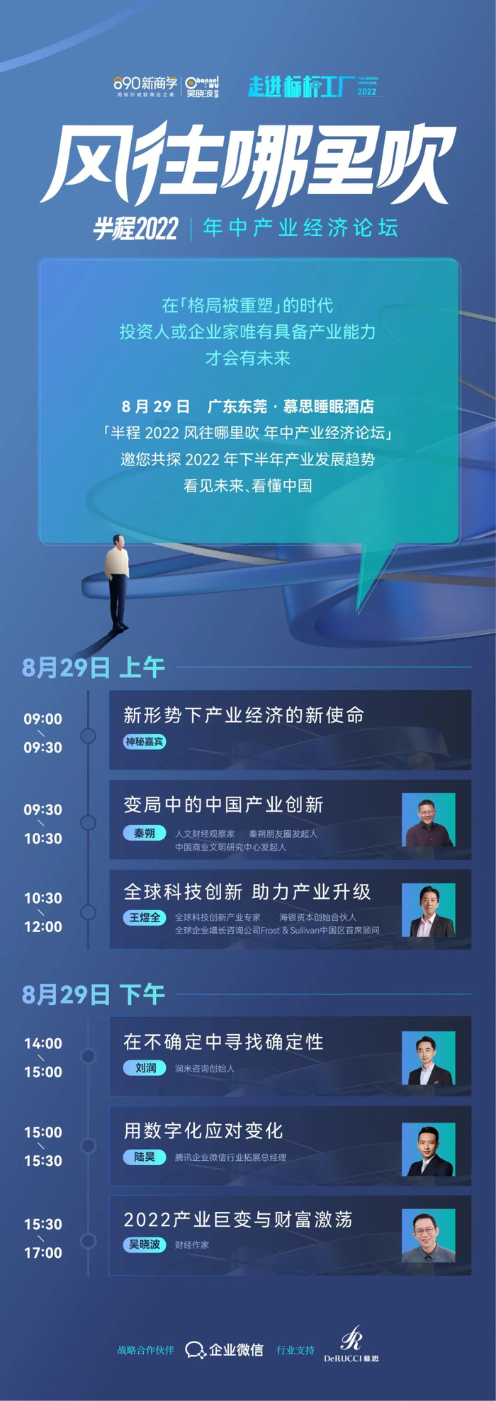 8月29日,我们将在东莞这个“世界工厂”举办年中产业经济论坛,吴老师将和秦朔、刘润、王煜全等一众学者专家共探2022年下半年产业发展趋势。