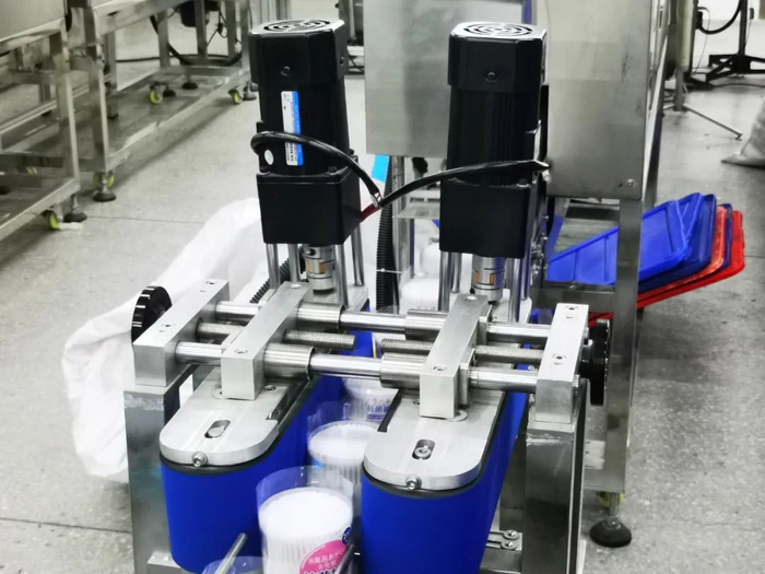 “两个或多个塑料盒套上一层塑料收缩膜”这个工序,专业也叫作套标。常见成品就是包裹一整箱瓶装饮料的一层塑料。套标需用套标机器,但首先需要人把其中的两个或者多个塑料盒,按照同样的标签朝向整齐。何乙辉正通过增加机器手、电子眼解决这个问题。此外还包括改造棉棒生产车间的搬运工序:棉棒生产后还是长棉棒,需要人搬到切割机上切成符合市场需求的短棉棒,未来可以采用机械手。