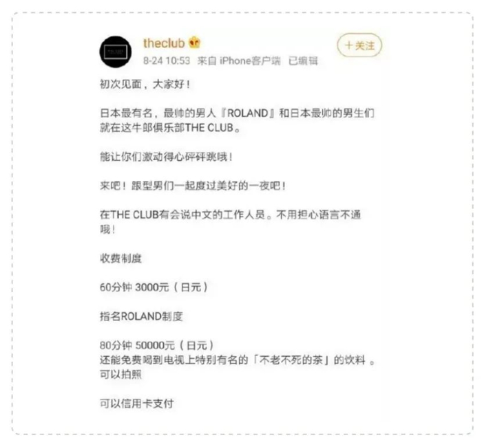 他早早就在微博开设账号,还上传过一段学中文的视频,号召中国女性前往日本体验牛郎的服务。