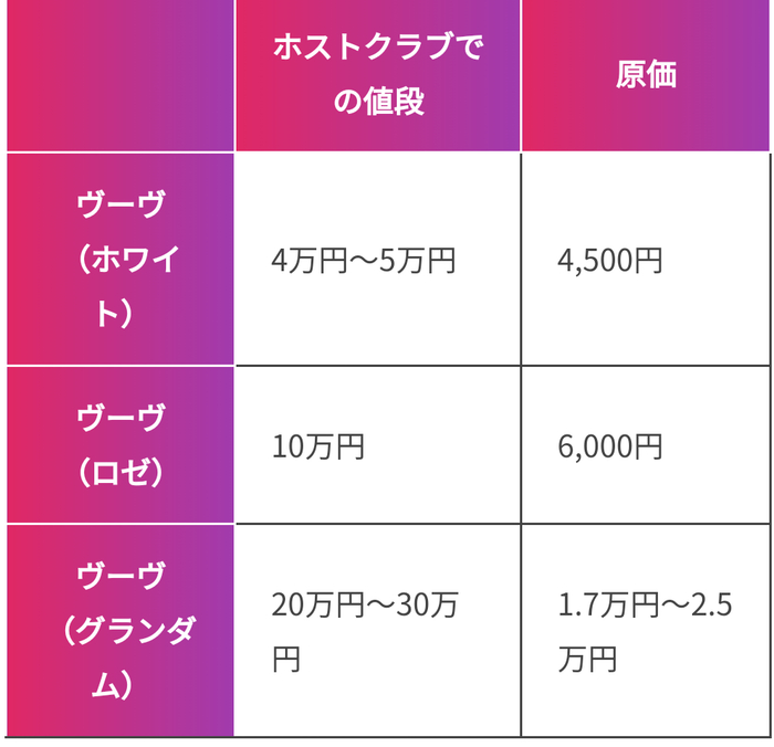 Veuve香槟在牛郎店中的价格和成本