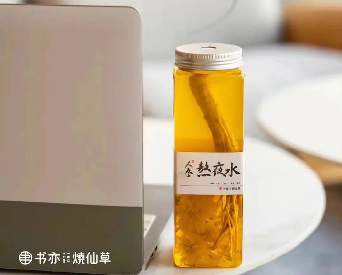 年初,书亦烧仙草上新人参熬夜水,使用了整根长白山人参,搭配黄山菊花、蜂蜜、乌龙茶;