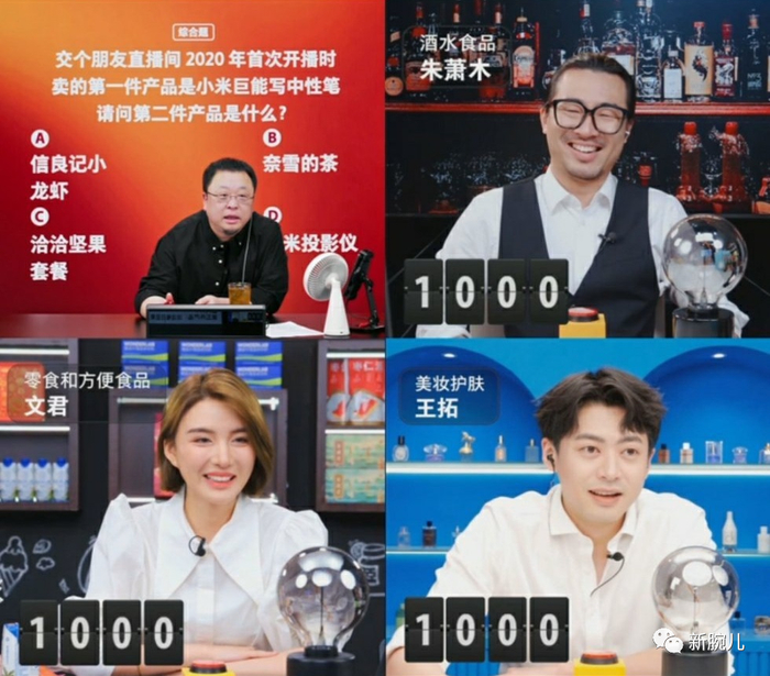 在第一次实验中,当晚开始罗永浩给三位主播抢答的第一个问题就是:交个朋友直播间2020年首播时卖的第一件产品是小米巨能写中性笔,请问第二件产品是什么?给出的四个选项:信良记小龙虾、奈雪的茶、恰恰坚果套装、极米投影仪,都是交个朋友直播间里,曾经带货过的商品。在勾起观众回忆的同时,又再一次替品牌方做了宣传。