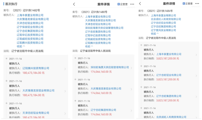 风财讯注意到,在辽阳中院的裁定书中提及的(2021)辽10民初224、242、274三个案件里面,与丰泰置业同时被列为被告人/被执行人的,均为忠旺系关联企业。