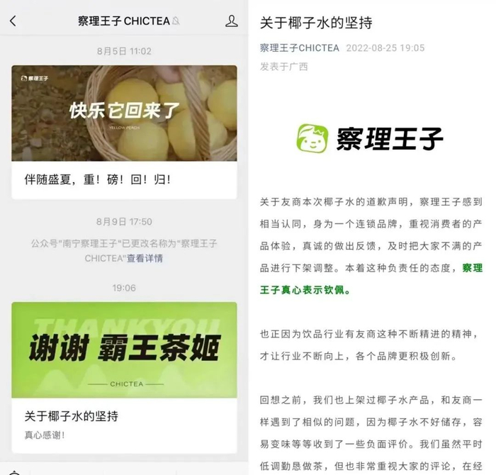 此外,有茶饮同行也表达了自己的尊重。25日晚,茶饮品牌察理王子在自己的官方公众号上发表了一篇文章《关于椰子水的坚持》,文中对霸王茶姬的做法和态度,表示钦佩。