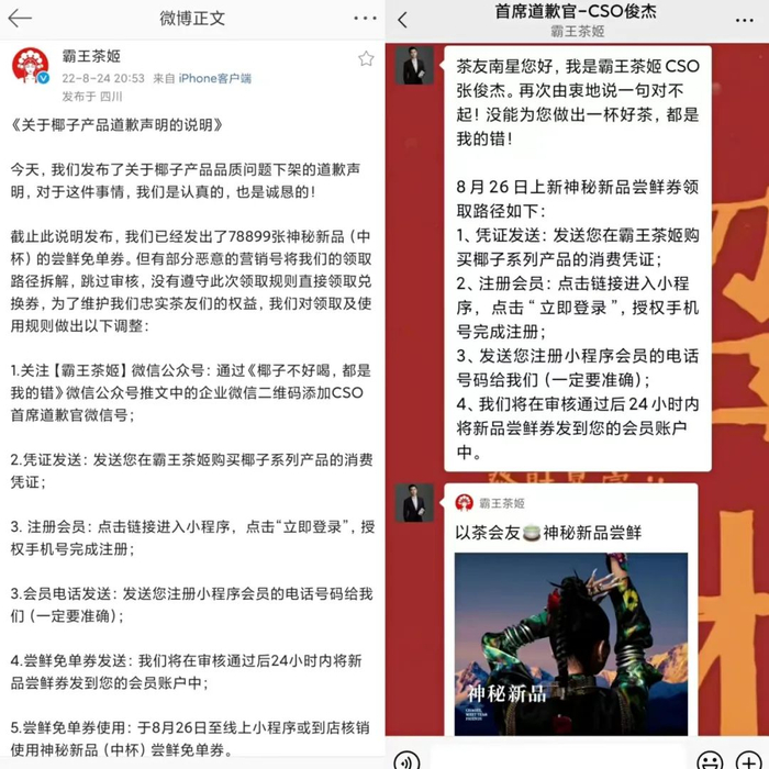 在舆论风向的影响下,8月24日,霸王茶姬的创始人张俊杰在官号上公开道歉“椰子不好喝,都是我的错”,下架这3款新品,并宣布由自己来担任“首席道歉官”。