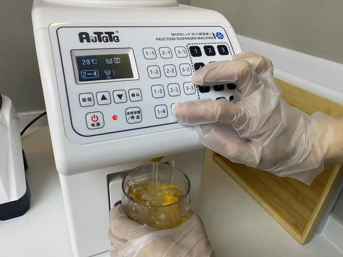 在茶饮店,制作饮品时对原料用量要求精准。用糖粉,称重、制作会十分麻烦,甚至出现未完全溶解、沉淀在杯中的情况。用糖浆,只需固定用量,由果糖机精准出糖即可,也能轻松溶于饮品。