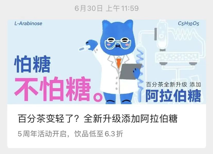 6月30日,百分茶将全线饮品免费升级成阿拉伯糖,推文中称可抑制约70%的蔗糖吸收;5月27日,丸摩堂将全线饮品免费升级成0卡糖,在推文中表示“热量少一半”。