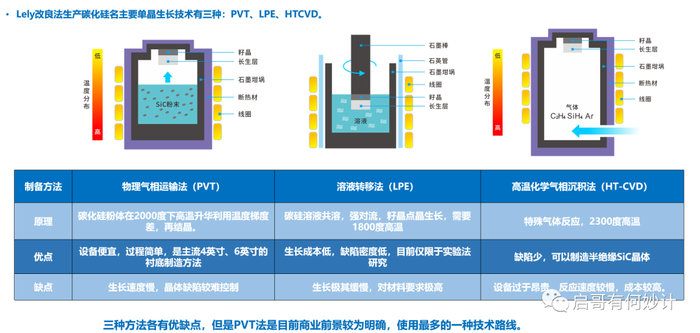 碳化硅的长晶技术大致有三种,PVT物理气相传输法,HT-CVD高温气相沉积法,以及LPE溶液法。