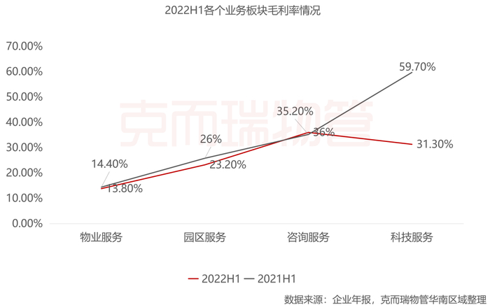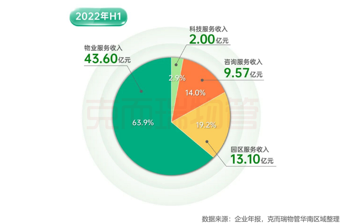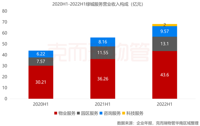 调整报告期内,绿城服务收入来自物业服务、园区服务、咨询服务及科技服务四个业务板块 。物业服务依然是集团最大的收入和利润来源,收入约43.6亿元,占整体收入的63.9%,同比增长20.3%,主要是得益于高品质的服务为其奠定了良好的市场基础,即使在大环境下行趋势下,依然内生强劲,成为绿城发展重要的本源。