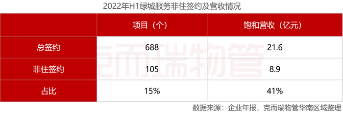 绿城服务积极布局非住市场新赛道,尤其商写、产业园、城市公共服务新赛道,2022年H1业绩期内已经初见成效,非住项目新签105个,占比15%,饱和营收8.9亿,同比增长71.6%,占比41.3%,同比提升近9个百分点。