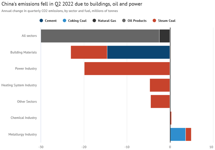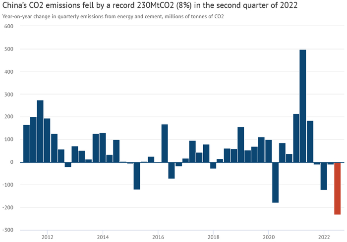 2022年第二季度,中国的二氧化碳(CO2)排放量创纪录地下降了8%,减少了2.3亿吨(MtCO2),是至少十年来降幅最大的一次。