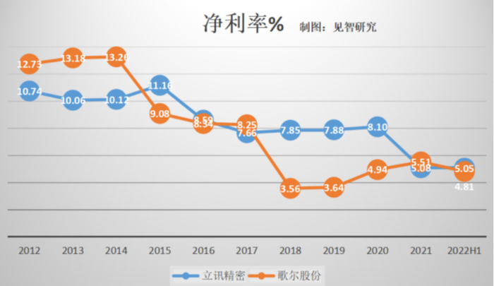 歌尔股份的毛利率下降更快,近十年从25.79%,下降到12.95%。并且,从2018年切入苹果链后,毛利率下降速度更快。